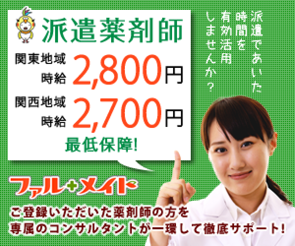 ファル・メイトは特に派遣薬剤師に強く、派遣薬剤師の求人数は業界最多を誇り、しかも関東地域なら2800円以上最低保障と高時給でもあります。