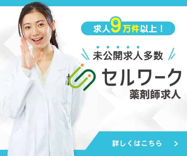 | セルワーク薬剤師 | 公式サイト | ・取扱い求人数業界最多👍 | 82,584 / 3,655 / 全2拠点 | 不明 | 不明 |