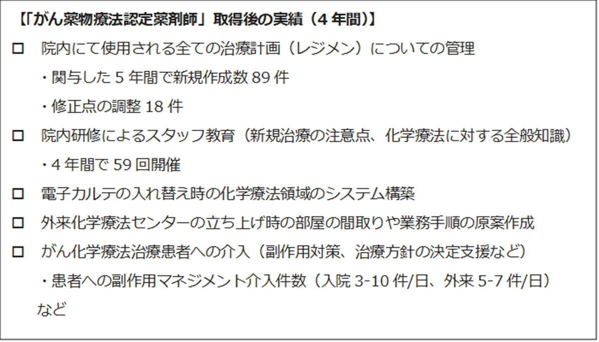 本業のスキルをさらに高める道は、私の場合「NST専門療法士」「がん薬物療法認定薬剤師」であり、先に述べたような自己成長、組織貢献ができました。